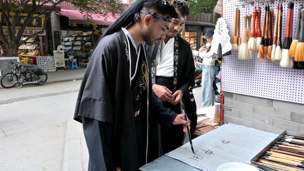 在书院门,留学生们了解书法艺术并尝试着自己去写,留学生浩天在中国学习了几年之后,他的字体刚劲有力,毫不逊色。浩天非常喜欢中国文化,对于书法的热爱程度痴迷不已。在场的人们对于他的字赞不绝口。