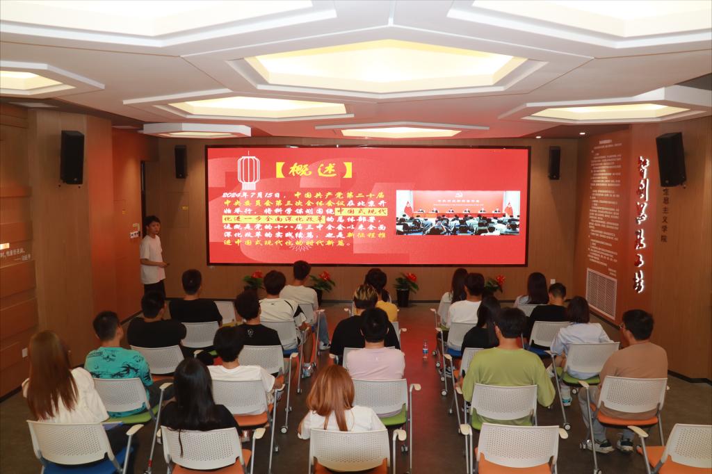 张金英博士紧紧围绕党的二十届三中全会的指导思想、主要内容、重大意义等方面,作了全方位、深层次、多维度的深度诠释,号召广大教师认真落实全会关于深化教育综合改革的新部署新要求,将新部署新要求转化为推动学校各项事业改革发展的强大动力。秦马研习社学生宣讲员郭书辰同学,用深入浅出的青年语言讲述了党的二十届三中全会的历史意义,号召同学们把自己的理想同祖国的前途、民族的命运紧密联系在一起,踔厉奋发、勇毅前行,为推进新时代中国式现代化贡献青春力量。