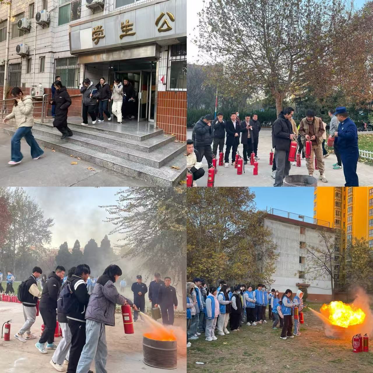 为落实省委厅关于2025年度消防安全月有关要求,切实增强广大师生的消防安全意识,提升应对突发火灾事件的应急处置能力和自救互救技能,11月18日,我校成功组织了火灾应急疏散及灭火实操演练。本次演练由学校保卫处牵头,联合学生工作部、土木学院、材料学院、化纺学院、国有资产处等多部门共同组织实施,500余名师生和第三方商户参与其中,渭城区文汇路消防所全程指导演练。