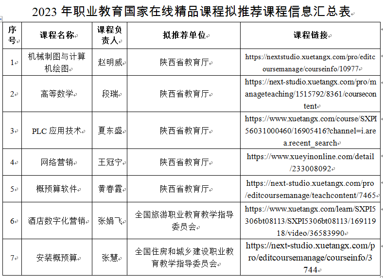 根据教育部办公厅《关于开展2023年职业教育国家在线精品课程遴选工作的通知》(教职成厅函〔2023〕26号)及陕西省教育厅办公室《关于开展2023年职业教育国家在线精品课程遴选推荐工作的通知》要求,经个人申报、部门推荐、专家评审,确定推荐《机械制图与计算机绘图》等5门课程通过省教育厅申报2023年职业教育国家在线精品课程,《酒店数字化营销》通过全国旅游职业教育教学指导委员会申报,《安装概预算》通过全国住房和城乡建设职业教育教学指导委员会申报,具体信息见2023年职业教育国家在线精品课程推荐汇总表。