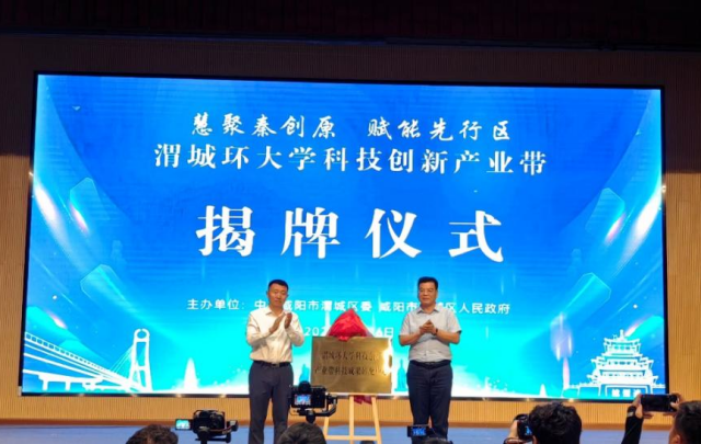 咸阳市委副书记贾珉亮和陕西工业职业技术大学校长刘永亮为“渭城环大学科技创新产业带科技成果转化中心”揭牌