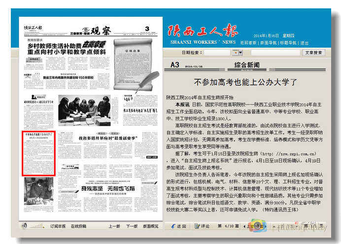 陕西工人报—陕西工院2014年自主招生网报开始
