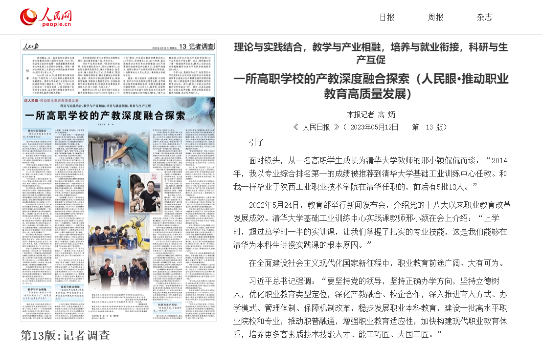 5月12日,《人民日报》刊发整版图文,以《理论与实践结合,教学与产业相融,培养与就业衔接,科研与生产互促——一所高职学校的产教深度融合探索》为题,6000字长文深度聚焦我校产教融合育人,助推高质量发展的生动实践。