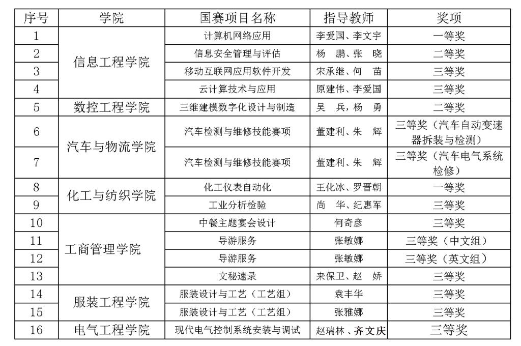 在这次全国技能大赛中,信息工程学院获一等奖1项、二等奖1项、三等奖2项;化工与纺织学院获一等奖1项、三等奖1项;数控工程学院获二等奖1项;工商管理学院获三等奖4项;汽车与物流学院获三等奖2项;服装工程学院获三等奖2项;电气工程学院获三等奖1项。
