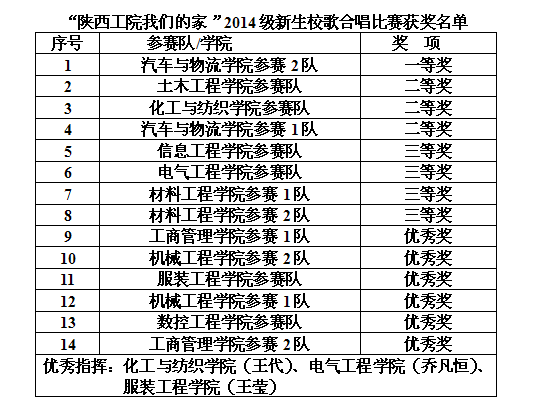 “历史名城,秦岭北望,明德笃学桃李芬芳……”比赛过程中,同学们以饱满的精神、高涨的热情、宏亮的歌声,唱出了陕西工院一甲子的风雨兼程和光荣梦想,唱出了2014级新生的蓬勃朝气和青春风采,更表达了新生们对学院的一片深情。台上歌声嘹亮,台下掌声阵阵。10个二级学院,14支代表队的精彩表演,使比赛现场气氛热烈,高潮迭起。经过激烈的角逐,汽车与物流学院2队以其嘹亮的歌声和良好的精神风貌夺得桂冠。
