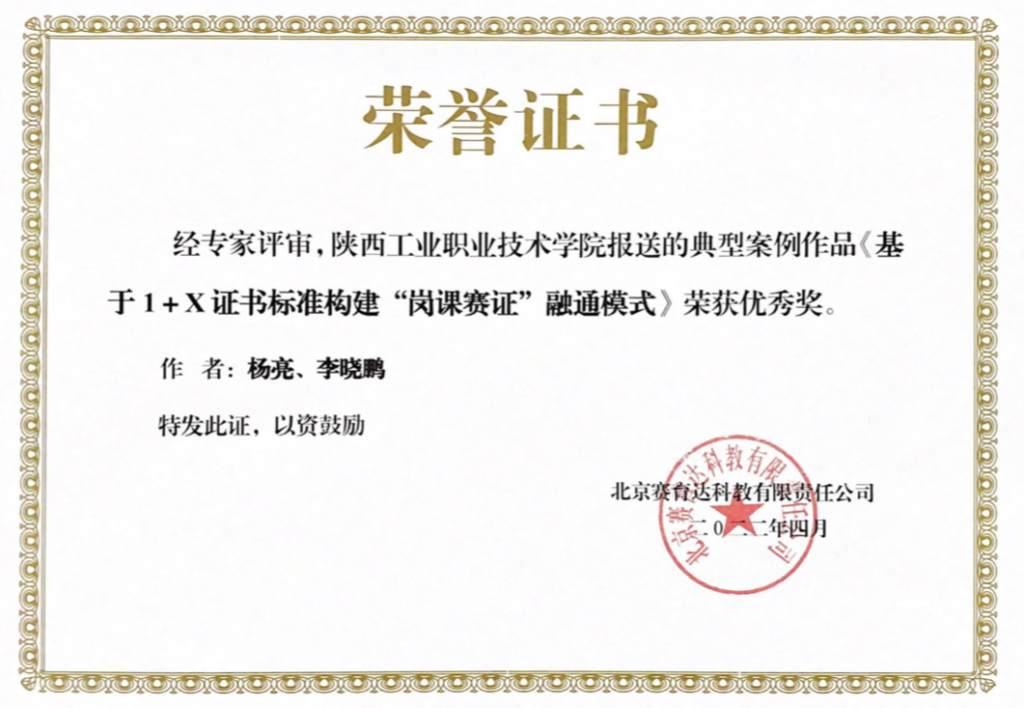 近日,由工业机器人应用编程职业技能等级证书评价组织,北京赛育达科教有限责任公司组织开展的1+X证书制度试点工作典型案例评选结果揭晓,我校航空工程学院申报的案例《基于1+X证书标准构建“岗课赛证”融通模式》荣获优秀奖。
