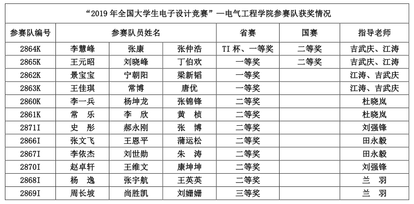 日前,“2019年TI杯全国大学生电子设计竞赛”获奖名单公布。电气工程学院选派的12支参赛队凭借扎实的专业知识、较强的创新设计能力以及良好的团队协作精神,取得了国赛二等奖2项、省赛一等奖4项以及省赛二等奖7项、三等奖1项的优异成绩。