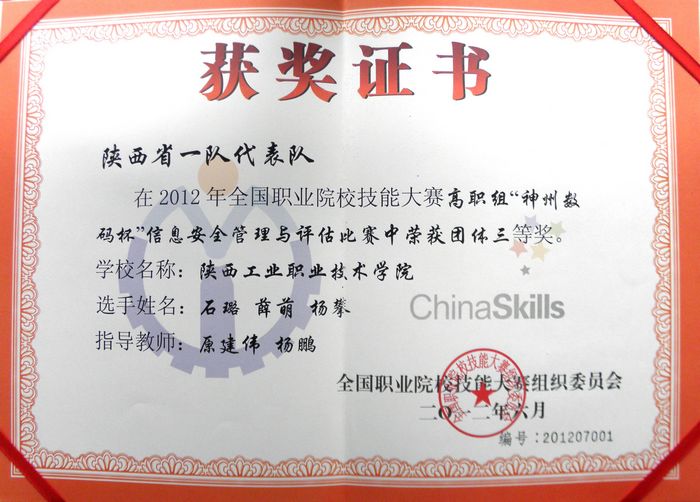 在信息安全管理与评估赛项中,信息工程学院网络1001班石璐、信管1001班杨攀和软件1101班薛萌同学组成的陕西省一队在全国参赛的68支代表队中冲出重围,荣获团体三等奖,成为该赛项设置以来陕西省首次获奖的参赛队。