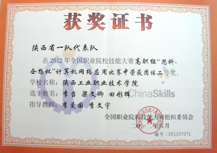 全国52个代表队156名队员参加了计算机网络应用赛项,经过6个小时的激烈拼搏,我院信息工程学院学生组成的陕西一队、二队双双荣获团体二等奖,实现了我省在该赛项零的突破。