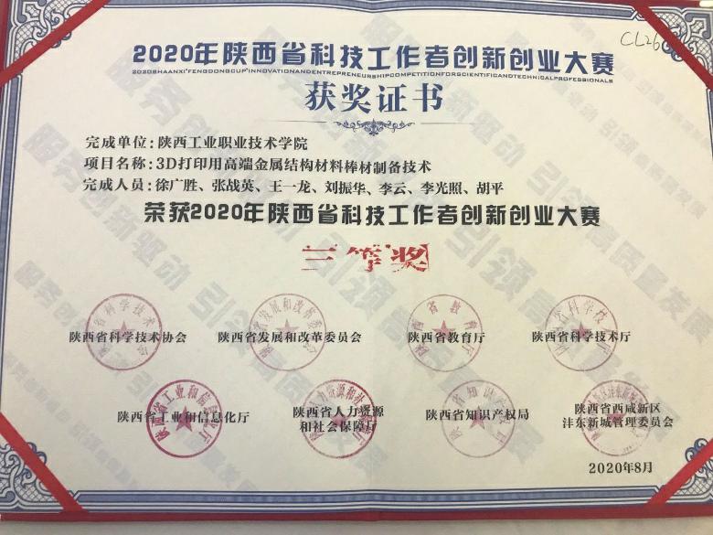 8月26日--27日,由陕西省科协、发改委、教育厅、科技厅、工信厅、人社厅、知识产权局、沣东新城管委会共同主办的2020年陕西省科技工作者创新创业大赛在西安举行。我院钛合金技术开发团队的“3D打印用高端金属结构材料棒材制备技术”项目荣获三等奖。