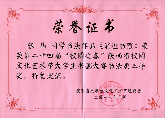 近日,由中共陕西省委教育工委、共青团陕西省委员会、陕西省学生联合会主办的第24届“校园之春” 陕西省大学生文化艺术节书画大赛在咸阳师范学院举行,包括我院在内的全省27所高校选派作品参加。我院帅凯强同学的作品《行书册页》、张晶同学的作品《笔近书随》荣获三等奖,展示了我院学生良好的文化素质。