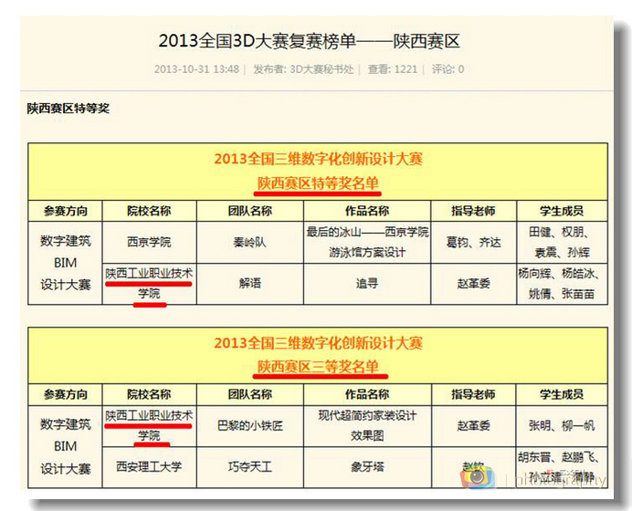 11月1日,2013年第六届全国三维数字化创新设计(3D)大赛复赛陕西赛区组委会公布了获奖榜单,由我院信息工程学院教师赵革委指导的图形图像制作专业1103班杨向辉、杨皓冰、姚倩、张苗苗同学的作品《追寻》获得陕西赛区特等奖,并入围全国现场总决赛,张明、柳一帆同学的作品《巴黎的小铁匠》获得三等奖。