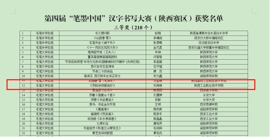 近日,陕西省教育厅办公室公布了第四届“诵读中国”经典诵读大赛和“笔墨中国”汉字书写大赛(陕西赛区)评选结果,我校大学生艺术团上报的朗诵作品《路标与灯盏》荣获一等奖,书法作品荣获三等奖,美育部教师张戈、赵恬添荣获优秀指导教师奖。