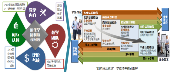 携手企业,创新现代学徒制培养模式,培养适应行业发展的高素质、紧缺型技术技能人才。按照“找问题、想办法、求突破”的思路,围绕制约现代学徒制培养的主要瓶颈问题,在传承我院3个国家现代学徒制试点专业成功经验的基础上,深化“课堂—车间、教师—师傅、学生—员工、作品—产品、学习—就业”等关键环节的改革创新,将导师角色互换体验、企业技改项目进课堂、“好师傅”示范引领等自创动作有机融入现代学徒培养过程,形成了以装备制造元素贯穿始终、具有鲜明特色的“四阶段五模块”现代学徒制培养模式。