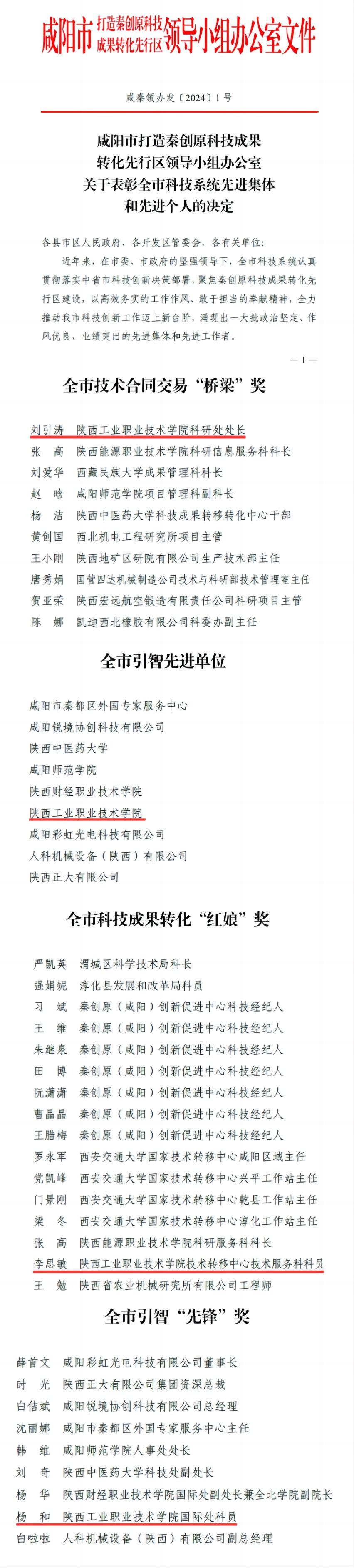 近日,根据《咸阳市打造秦创原科技成果转化先行区领导小组办公室关于表彰全市科技系统先进集体和先进个人的决定》(咸秦领办发【2024】1号)《中共咸阳市委科技工委关于表彰2023年度咸阳市优秀科技大使的通报》(咸科工委发【2024】3号)文件精神,我校获得咸阳市多项表彰,其中学校荣获2023年度咸阳市引智先进单位,科研处处长刘引涛获咸阳市技术合同交易“桥梁”奖和优秀科技大使荣誉称号、西部创新创业研究院院长胡平获优秀科技大使荣誉称号,科研处技术服务科李思敏获咸阳市技术合同交易“红娘”奖、国际交流处杨和获咸阳市引智“先锋”奖。