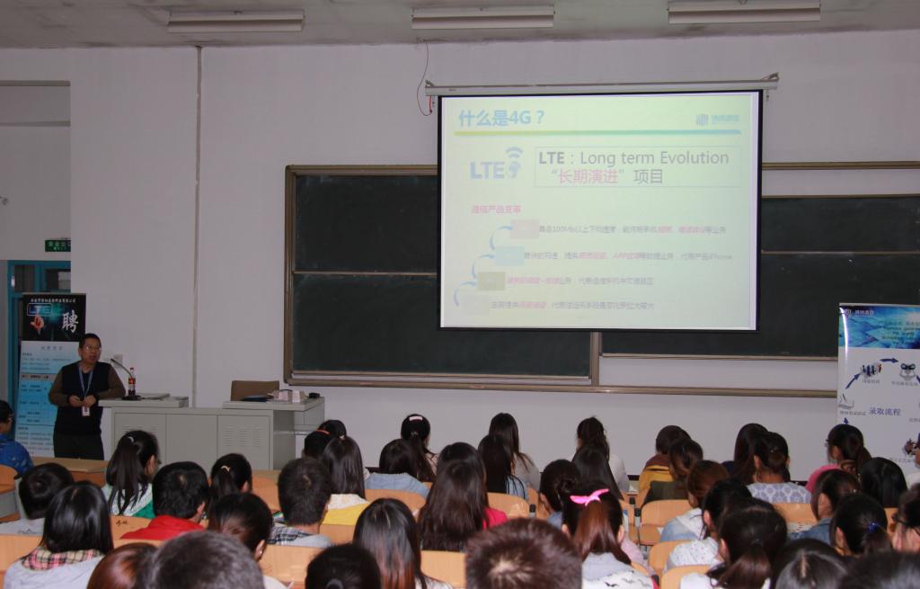 讲座中,姜育生总监用生动的语言,详实的实例为同学们讲解了移动通信技术由1G到4G的演进过程,重点阐述了4G技术的优越性及未来的演进方向,并介绍了当前各移动运营商在4G网络建设方面的具体情况,使学生深入了解了未来通信行业的人才紧缺程度及就业前景。