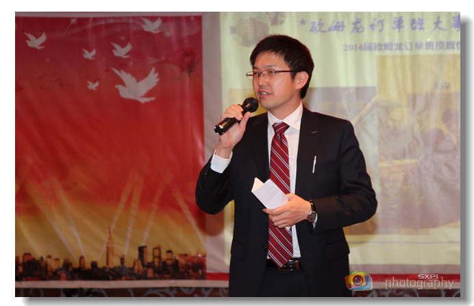 王天哲副书记代表学院热烈欢迎欧姆龙公司的各位领导出席本次联谊会,并对“欧姆龙班”成立两年来取得的成果表示高度肯定。随后,岩冈俊行部长代表该公司所有员工向学院领导、老师及欧姆龙班的全体学生致以新年的祝福,对各位领导和任课老师给予欧姆龙订单班的支持和帮助表示忠心的感谢,还为2013届欧姆龙班全体学生赠送新年礼物。