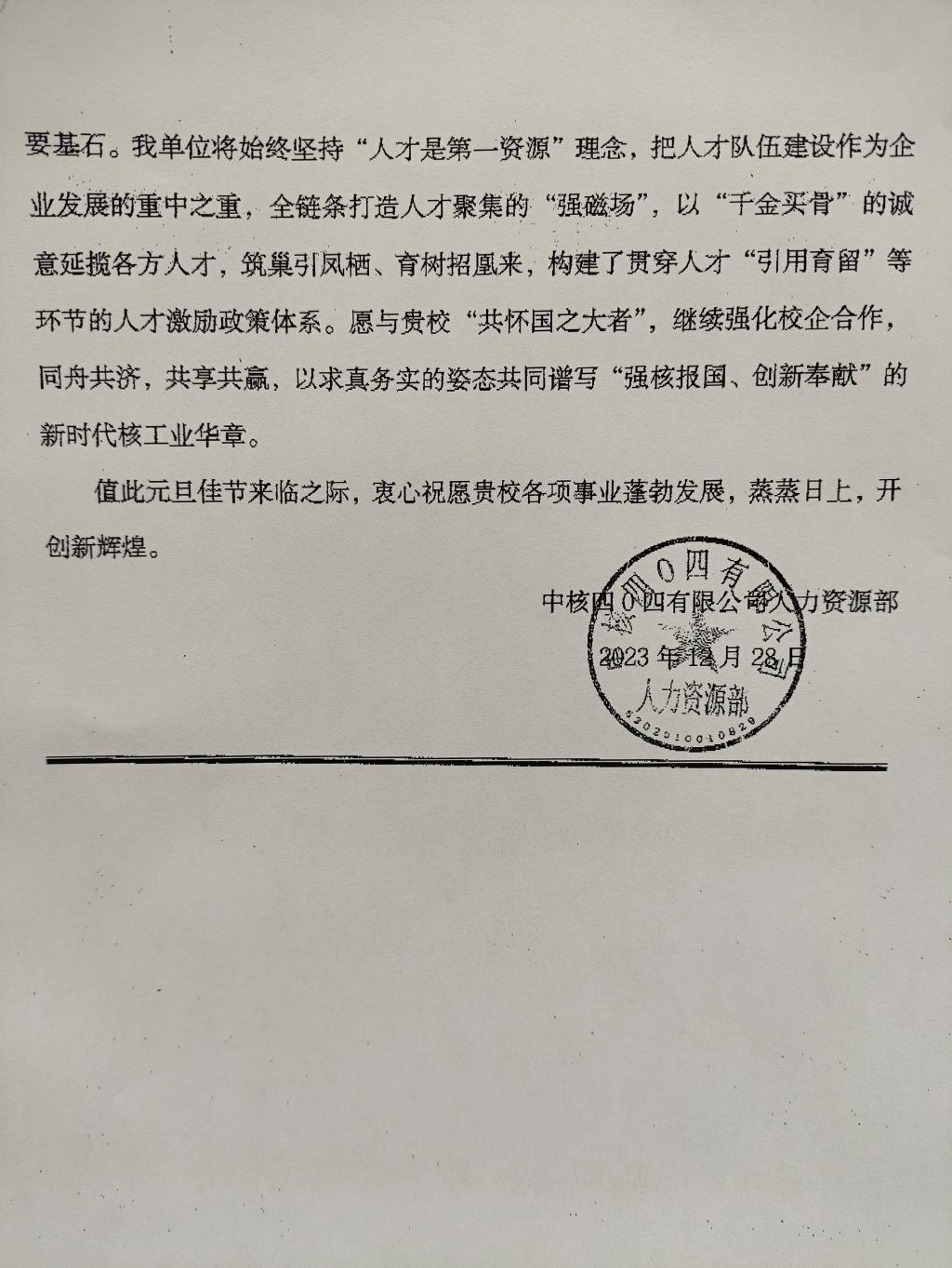 时光荏苒、岁序更替,2023年已临近尾声,中核四〇四有限公司人力资源部向贵校长期以来对我单位招聘工作的大力支持致以最诚挚的感谢!