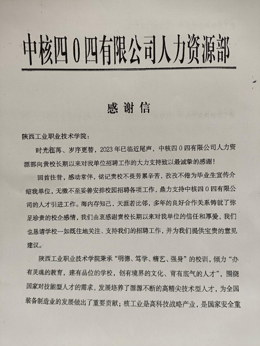 12月28日,中核四〇四有限公司向我校发来感谢信,对学校校园招聘工作给予的大力支持表示诚挚的谢意。感谢信全文如下: