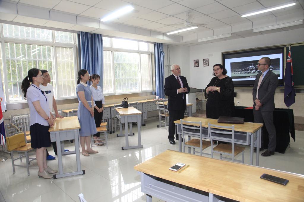 惠朝阳书记代表全校2万余名师生向傅恩莱大使一行莅临访问表示热烈欢迎。在介绍了学院基本情况和近年来在标志性教学成果、主要办学指标和国际交流合作等方面取得的成绩后,他表示,新西兰职业教育发达,在世界享有盛誉,近年来我院与新西兰合作院校开展的交流合作项目有力地促进了学院的内涵建设,提升了国际影响力。在我院争创中国特色高水平高职院校和专业群的重要时刻,傅恩莱大使的访问对进一步促进我院与新西兰的教育交流合作是一个重要的契机,对推进落户我院的中国-新西兰职业教育示范项目教师培训基地工作具有重要意义。随后,他从举办国际会议、开发微型工程证书、举办职教法讲座、选派骨干教师赴新西兰培训、开展职教课题研究等方面,向傅恩莱大使汇报了中国-新西兰职业教育示范项目教师培训基地的工作设想,并希望新西兰驻华大使馆为我院在合作办学、推荐新西兰青年来校交流学习方面牵线搭桥,提供支持和帮助。