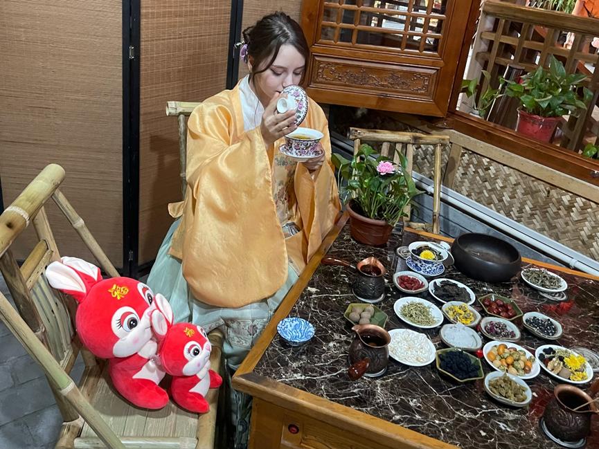 在大家品茶的过程中,罗琳老师向留学生们介绍了汉服的历史发展和演变过程,生动讲解和呈现汉服着装礼仪的规范和要点,还介绍了作为中华民族文明的标志之一,汉服是维系中华民族物质与精神传承的重要纽带,也是“衣冠上国”、“礼仪之邦”的重要体现。在互动环节中,印尼留学生唐美和俄罗斯留学生萨莎饶有兴致地穿上了汉服,认真学习了拜礼、平手礼、万福礼等传统礼仪。萨莎兴奋的说:“这次活动穿上美丽的汉服,让我有一种穿越时空、回到古代中国的感觉。喝到好喝的中国茶,并且学到中国传统茶艺文化,我感到非常开心。”