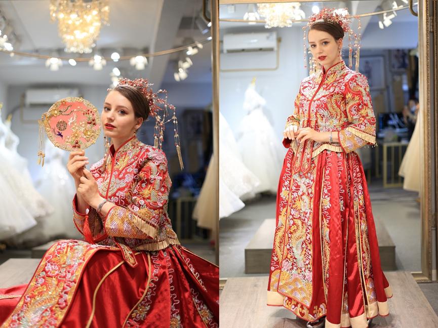 秀禾服的颜色。红色秀禾服给人一种喜庆热烈的感觉,代表红红火火的寓意,不仅用来衬托喜庆的气氛,也代表未来的日子红红火火。金色秀禾服有种贵气高雅气场,金色秀禾服与现代元素无缝结合在一起,东方古韵十足,尽展女性的端庄典雅之美。蓝色秀禾服给人一种清新的感觉,有种奢雅而自然的气息,还能呈现出柔和的视觉效果,非常别致典雅。