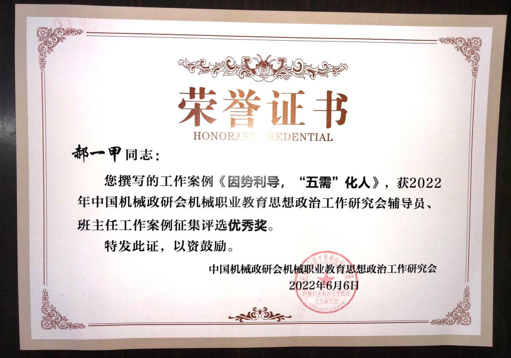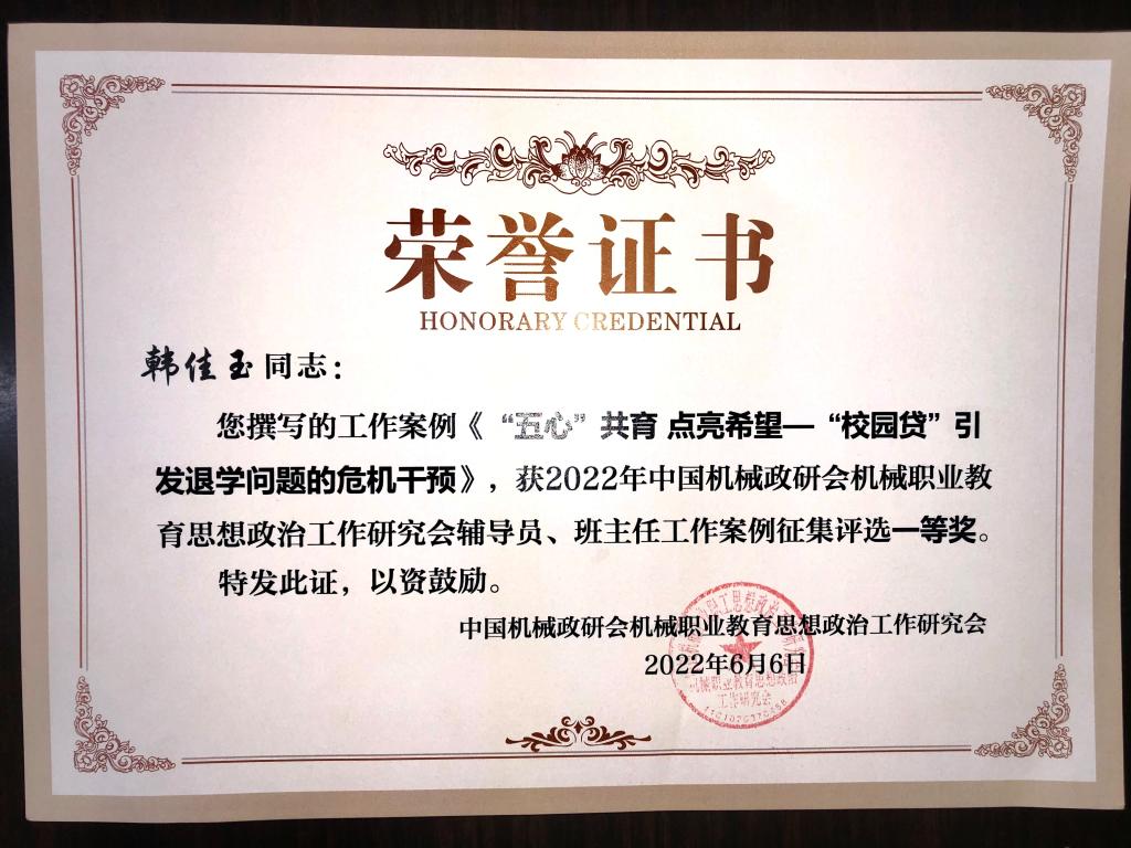 近日,2022年中国机械政研会机械职业教育思想政治工作研究会辅导员、班主任工作案例征集评选活动结果公布,我校韩家玉、万永亮、郝一甲三位辅导员撰写的《“五心”共育 点亮希望--“校园贷”引发退学问题的危机干预》《新冠肺炎疫情防控期间武汉留守实习学生教育管理工作》《因势利导,“五需”化人》工作案例在此次评选中分获一等奖、三等奖、优秀奖。