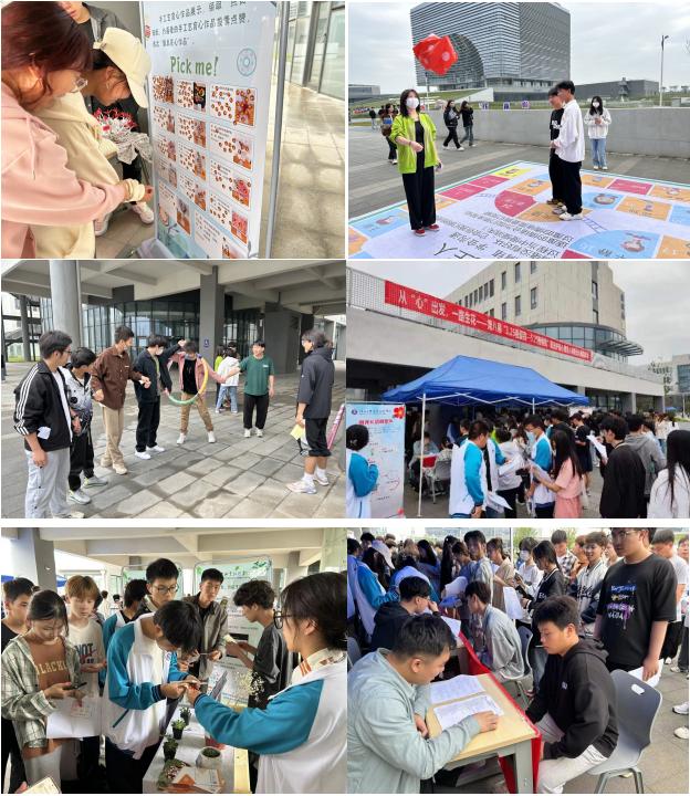 活动现场设有“妙笔心花签名区”“芬芳花香传递区”“阳光花语解密区”“花漾年华活动区”“暖心奖品兑换区”五大活动区域。在“妙笔心花签名区”设置有签名横幅,倡导同学们热爱生活、悦纳自我,积极关注自己的心理健康;“芬芳花香传递区”设有二级学院“一站一品”展示区、手工艺作品展示区、时光慢递展示区以及绿植领养成果展示区四个区域,展示了我校第八届“阳光护航”心理育人季系列实践活动中的部分优秀心理作品,同学们通过展示富有创意的手抄报、vlog作品、摄影作品以及精巧的手工艺作品来表达自己内心的真情实感;“阳光花语解密区”设置了专业的心理测评问卷,并有专业老师在场为同学们讲解,帮助同学们正确客观地认识自我,同时为同学们发放了心理知识手册、心海阳光报等宣传品;“花漾年华活动区”设置了“情绪飞行棋”“盲人贴鼻”“不倒森林”“穿越呼啦圈”“蜻蜓点水”等多个心理游戏活动,让师生在参与游戏的过程中放松身心、愉快合作、亲密交流;在“暖心奖品兑换区”,同学们可以通过参加以上活动集齐花朵贴纸兑换奖品。