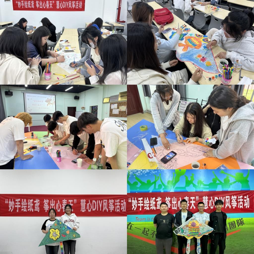 本次活动分为手绘风筝和放飞风筝两个环节。手绘环节于四月底开展,同学们在老师的指导下,学习了风筝的起源、用途、制作及风筝绘画心理疗愈作用。五彩斑斓的风筝布、琳琅满目的装饰材料和各式各样的工具摆满了制作区。同学们或三五成群,或独自一人,挑选着心仪的风筝骨架和布料,动手制作属于自己的风筝。有的同学在风筝上绘制了卡通人物,有的则选择了中国传统龙图案,还有学生尝试将现代抽象艺术与风筝结合,每一只风筝都展示出独一无二的风格,充满了个性和创造力。