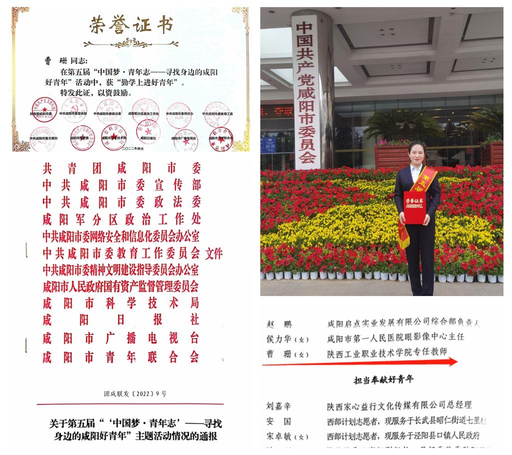 近日,由共青团咸阳市委联合市委宣传部等单位共同开展的第五届“中国梦·青年志——寻找身边的咸阳好青年”主题活动公布评选名单。经过单位推荐、资格审查、评委投票等程序,我校信息工程学院教师曹珊在活动中脱颖而出,被授予“勤学上进好青年”荣誉称号。