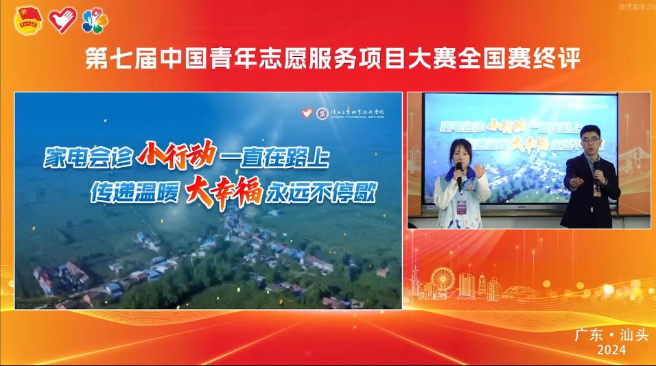 11月30日至12月1日,由共青团中央、中央社会工作部、民政部、水利部、文化和旅游部、国家卫生健康委员会、中国残疾人联合会和中共广东省委、广东省人民政府联合主办的第七届中国青年志愿服务项目大赛2024年集中交流活动在广东汕头举行。我校首次参加国赛,取得1银1铜的优异成绩,是陕西省内唯一获奖的高职院校。