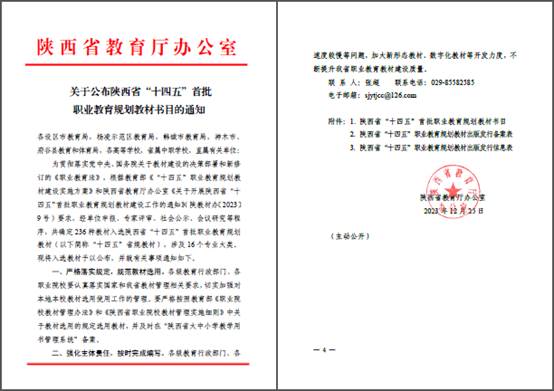近日,陕西省教育厅公布了《陕西省“十四五”首批职业教育规划教材书目的通知》。我校共有20本教材入选陕西省“十四五”首批职业教育规划教材书目,居全省高职首位。
