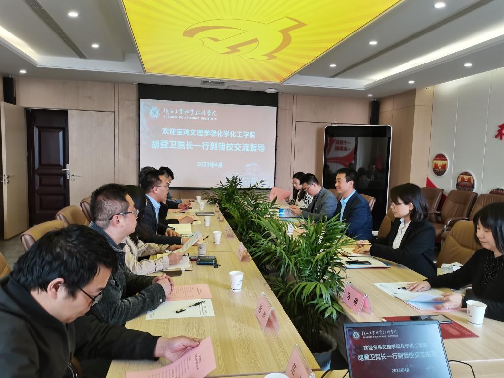 刘引涛处长首先对胡登卫院长一行的到来表示热烈的欢迎。随后,参会人员共同观看了我校宣传片。接着,科研处副处长余军堂从建机制、搭平台、组团队等几个方面对我校的科研情况作了详细的介绍。胡登卫院长对宝鸡文理学院及化学化工学院基本情况作了说明。材料工程学院副院长李光照、化工与纺织服装学院副院长刘迪分别介绍了各自学院的情况。最后,双方就科研基本情况以及后续的交流合作进行深入沟通。