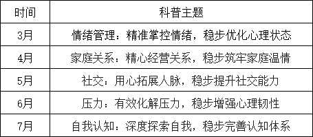 自3月起,“心光驿站”每月将围绕不同主题开展科普活动。3月聚焦 “情绪管理”,剖析情绪根源,传授调节方法,助学生把控情绪、优化心理,从容应对压力。4月着眼 “家庭关系”,改善亲子沟通、化解矛盾,引导学生经营家庭,筑牢温情防线。5月开启“社交”主题,紧扣沟通、倾听要点,助力学生拓展人脉、提升社交能力。6月关注“压力”问题,借助海报与讲座揭示压力来源及影响,帮学生化解压力、增强心理韧性。7月开展 “自我认知” 活动,在学期末助力学生探索自我、明确方向、激发潜能,迎接新学年。
