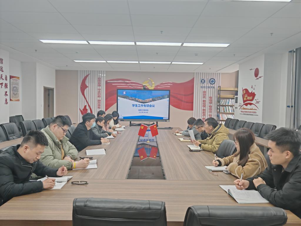 为进一步统一思想、明确目标,确保新学期各项工作平稳有序开展,信息工程学院于2月28日在崇理C801会议室召开了学生工作专题会议。信息工程学院党总支书记王伟、副书记郭新玲、全体辅导员参加了会议,会议由学工办主任赵松主持。