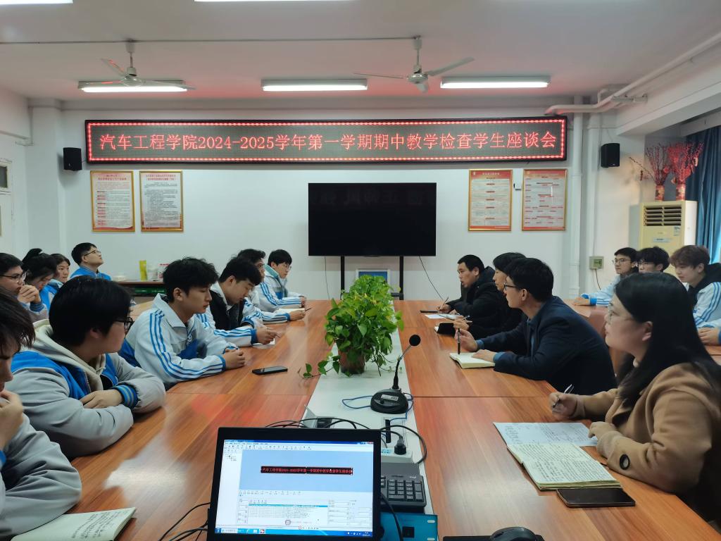 为深入了解学生学习状况,及时发现并解决问题,强化学生日常管理。11月25日下午,汽车工程学院在崇文主楼六楼会议室召开了2024-2025学年第一学期期中教学检查学生座谈会。汽车工程学院党总支书记高亚宁、副院长(主持工作)许冀阳、教学办主任朱辉、学工办主任胡瑞霞、辅导员以及2023级、2024级学生代表共30余人参加了此次座谈会。
