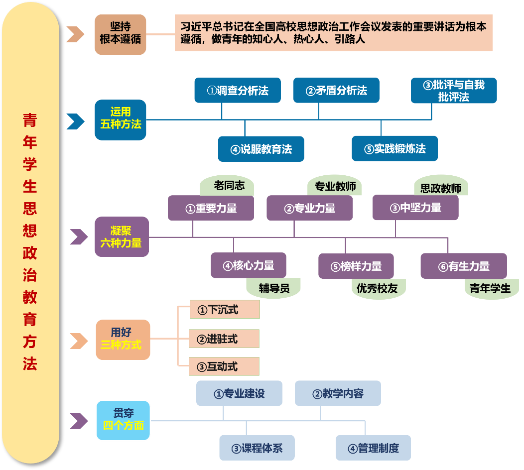 摸准学情创新方法凝聚力量形成思想政治工作合力。以习近平总书记在全国高校思想政治工作会议发表的重要讲话为根本遵循,做青年的知心人、热心人、引路人。结合学情实际,总结运用调查分析、批评与自我批评、实践锻炼、说服教育等工作法,在应对新时期青年需求多元、价值取向多元等特点挑战时,注重发挥六种力量的作用,即老同志的重要力量、专业教师的专业力量、思政教师的中坚力量、辅导员的核心力量、优秀校友的榜样力量、青年学生的有生力量,将思想政治教育贯穿人才培养体系各个方面,提高新时代育人质量。在开展习近平新时代中国特色社会主义思想和党的二十大精神学习过程中,深入学习领会党的创新理论的同时,掌握运用好党的创新理论来指导学生思政工作新实践。