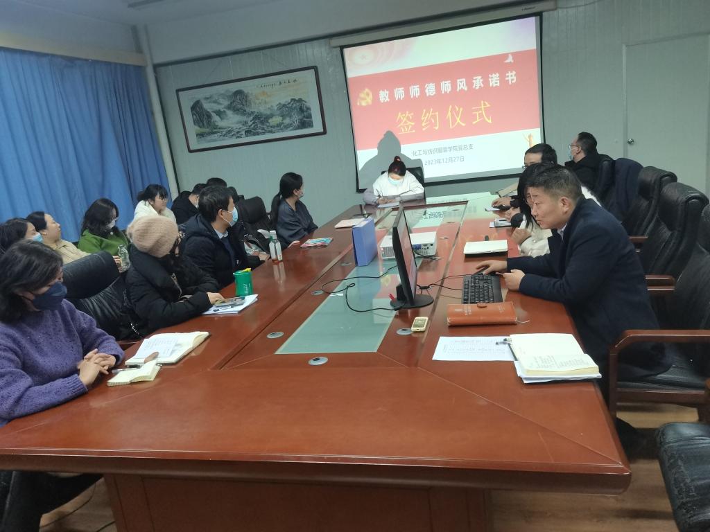 为深入学习贯彻习近平总书记关于教育的重要论述,加强教师队伍师德师风建设,扬新风正气树教师形象,12月27日下午,化工与纺织服装学院召开主题为《学习贯彻党的二十大精神树师德正师风铸师魂》师德师风建设专题会暨新进教师《师德师风承诺书》签订仪式,会议由化工与纺织服装学院党总支书记杨修国主持。