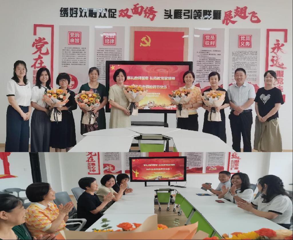 在教师节特别活动中,刘迪院长带领青年教师们手捧鲜花走进课堂,为兢兢业业传道解惑的老教师们献上鲜花,青年教师、学生们齐声祝福老教师们节日快乐,现场掌声雷动、气氛热烈。随后,党总支开展“献礼教师前辈 弘扬教育家精神”主题党日活动,党总支书记杨修国、院长刘迪组织新老教师通过座谈方式诠释和理解教育家精神,高度赞扬了老教师们为学院建设、学生成长所作出的卓越贡献。最后,青年教师表示:坚决落实立德树人根本任务,始终保持对教育事业的热情,继承并发扬学院老教师倾心教育事业的优良传统,争做教育家精神的践行者。