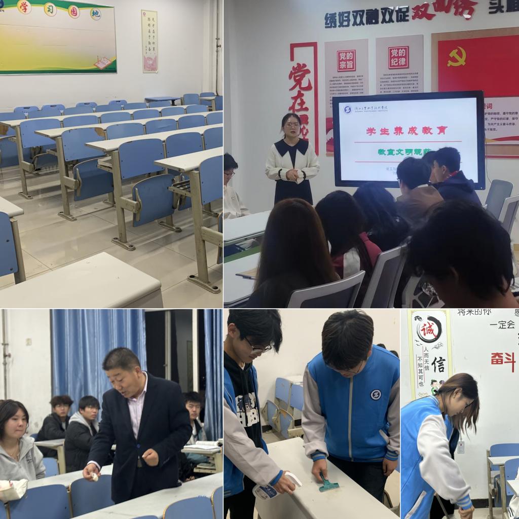 健全清洁制度落实长效管理。学院加大检查巡查力度,学工办主任曹淼带领学工办全体成员逐间教室检查,现场指导,提出要求,记录考核,复盘整改。一方面,学院建立教室定期清洁制度,增加值日生的数量,各教室由专人负责监督;另一方面,明确教室清洁的内容和标准,确保教室卫生保持的持续性和有效性,形成了维护教室卫生的长效措施。