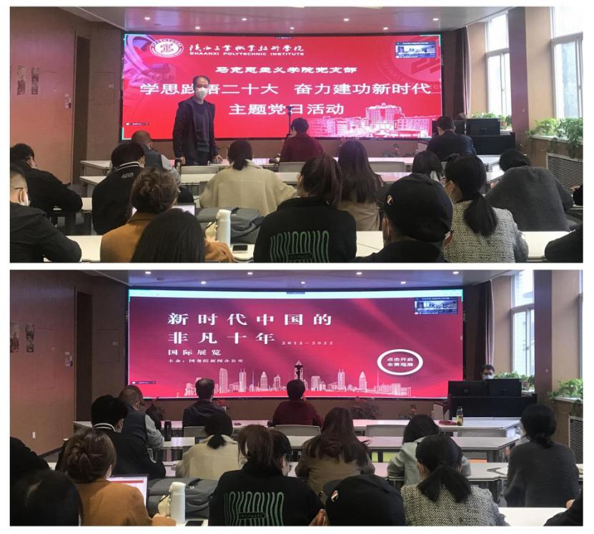 随后,在总支委员陈杜昊的操作下,全体与会党员通过浏览国务院星空(中国)办主办的线上虚拟展馆——“新时代中国的非凡十年”展馆,跟随习近平总书记的足迹,从续写发展奇迹、创造幸福生活、提升治理效能、汇聚人民伟力、共建美好世界五个方面,充分了解了新时代中国非凡十年的精彩故事,并结合二十大精神学习和思政课教学进行了深入交流。