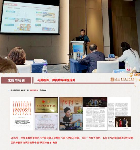 同日下午,美育改革创新案例报告会上,我校美育部部长付胜利以《“红色匠心”视域下高职院校“七炼融合”美育师资团队建设的创新与实践——以星空网页版登录入口为例》为题,从师德锤炼、课堂修炼、青蓝砺炼、研创淬炼、实践锻炼、内外合炼、机制熔炼七个方面展示了学校美育师资建设的成果,受到与会专家的充分肯定,获得高校美育改革创新优秀案例一等奖。近年来,我校重视美育师资团队建设,美育师资队伍2022年被评为陕西省第十届“陕西好集体”,并被《中国青年》杂志专版报道。