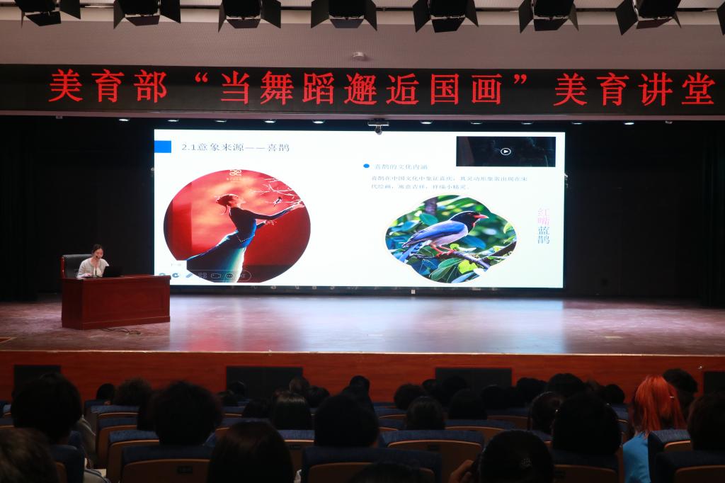 3月25日下午,我校《美“育”芳华》系列讲堂第二期在经开校区图文报告厅(二)如期举行。讲座《当舞蹈遇上国画看〈喜上枝头〉如何惊艳春晚》由美育部张雅馨老师主讲,信息工程学院协办。此次讲座围绕春晚节目《喜上枝头》带领现场听众走进舞蹈与国画相互交融的艺术世界,展开了一场别开生面的艺术之旅。