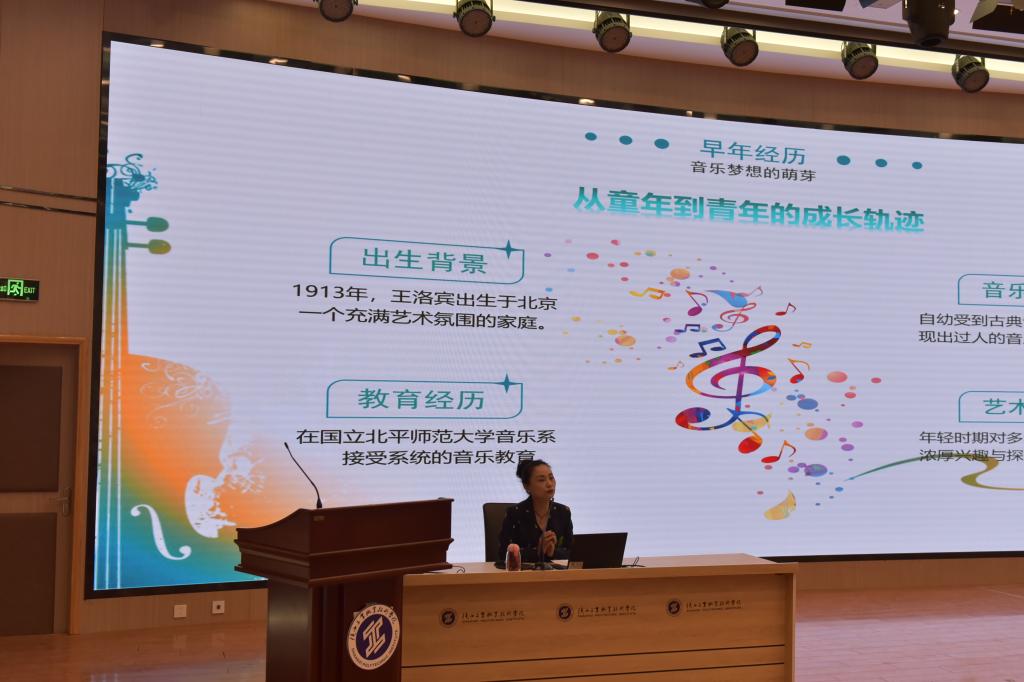 讲堂开始,党焱老师向大家详细介绍了王洛宾的生平。王洛宾是中国20世纪最负盛名的民族音乐家之一,被誉为“西部歌王”。他一生创作歌剧七部,搜集、整理、创作歌曲1000余首,出版歌曲集六册。这些歌曲不仅在国内广为流传,还在国际上获得了极高的声誉。为了让师生有更直观的感受,在讲解过程中党焱老师精心选取《在那遥远的地方》《达坂城的姑娘》等经典曲目现场播放。让在场师生在欣赏美妙旋律的同时,更深入地理解了歌曲背后的故事与情感。熟悉的旋律响起,师生们沉浸其中,大家明白这些歌曲不仅是音符的堆砌,更是情感与文化的结晶。她还讲述了王洛宾遭遇重重困境,在艰苦环境下的创作历程,三次入狱也未能磨灭他对音乐的炽热追求,却始终坚守对音乐的热爱,将一生献给了西部民歌的创作和传播事业,师生们被他的坚韧与执着深深打动。