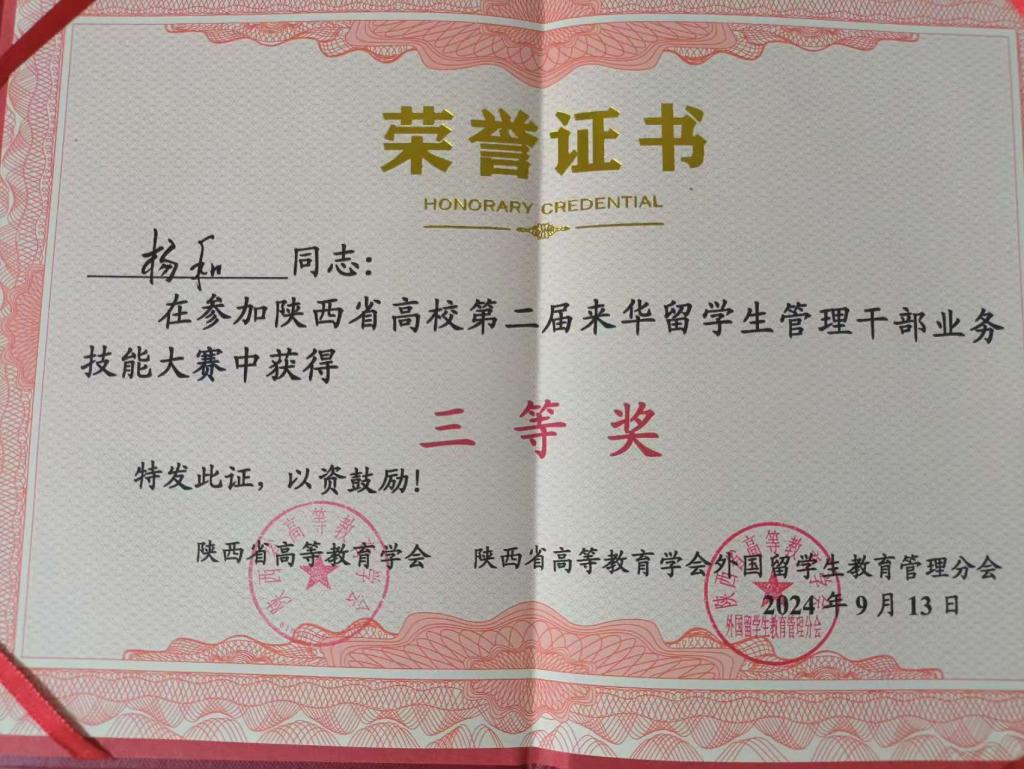 9月13日下午,陕西省高校第二届来华留学生管理干部业务技能大赛在西安石油大学举行,我校国际教育学院教师杨和荣获三等奖。