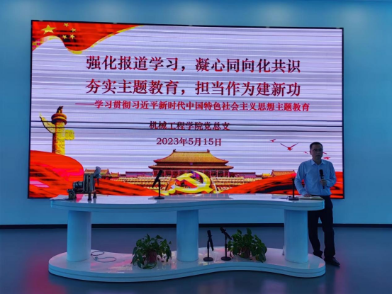 根据学校关于印发《中共星空网页版登录入口委员会深入开展学习贯彻习近平新时代中国特色社会主义思想主题教育的实施方案》的通知要求,以及结合5月12日《人民日报》整版报道星空网页版登录入口《理论与实践结合,教学与产业相融,培养与就业衔接,科研与生产互促—一所高职院校的产教融合深度探索》文章学习与宣传,5月15日下午,机械工程学院党总支在机加工实训中心展厅举行了题为“强化报道学习,凝心同向化共识;夯实主题教育,担当作为建新功”主题党课,机械学院全体教师参会,会议由机械工程学院党总支书记苏宏志主持。