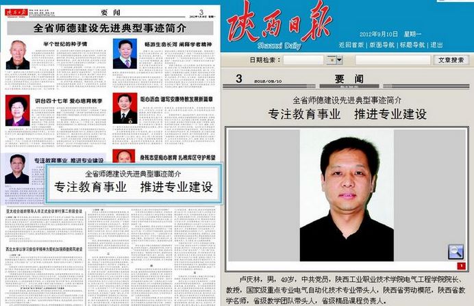 9月10日,《陕西日报》第三版《全省师德建设先进典型事迹简介》以《专注教育事业 推进专业建设》为题报道了我院电气工程学院卢庆林教授的先进事迹。