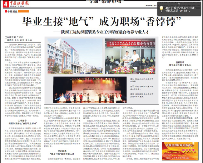 7月26日,《中国纺织报》第四版刊发了记者严家民撰写的《毕业生接“地气”成为职场“香饽饽”》一文,从“工学结合,课程体系接轨典型职业标准”、“校企融通,度身打造高级技能人才”、“创新引领,提升毕业生就业竞...