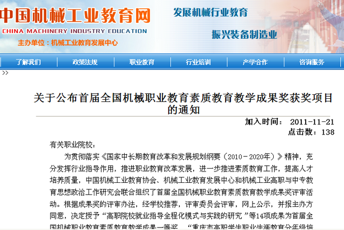 近日,由中国机械工业教育协会、机械工业教育发展中心、机械工业高职与中专教育思想政治工作研究会联合组织举办的“首届全国机械职业教育素质教育教学成果奖”评审活动结束,我院申报的三项素质教育成果获得两项一等...