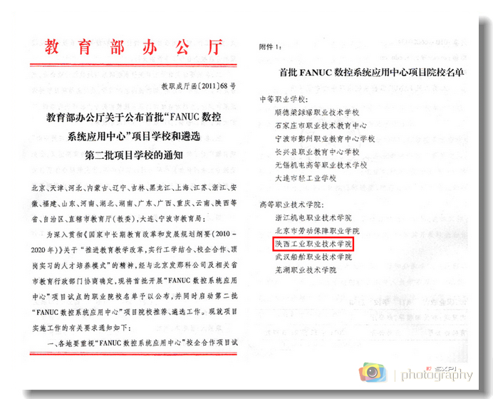 近日,根据教育部办公厅《关于公布首批“FANUC数控系统应用中心”项目学校和遴选第二批项目学校的通知》(教职成厅函[2011]68号),我院成为首批开展“FANUC数控系统应用中心”项目试点的高等职业院校,也是陕西省唯...
